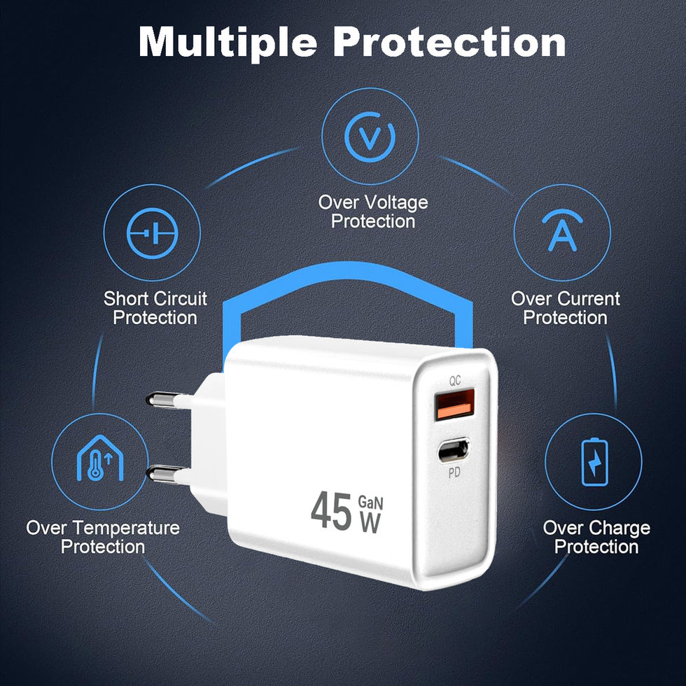 This charger is compatible with a wide range of popular devices that support PD (Power Delivery) and QC (Quick Charge) fast charging technologies, including iPhone (iPhone 17, iPhone 16, iPhone 15, iPhone 14 Series, etc), Samsung (Samsung Galaxy S26, S25, S24, S23, S22 Series; Note 20, Note 10, etc), Xiaomi, OPPO, Vivo, Realme, Google Pixel, iPad (iPad Pro, iPad Air, iPad Mini, etc), Samsung Galaxy Tab, Xiaomi Pad, Huawei Tablet, MacBook, Nintendo Switch, AirPods, power banks, and other devices that require up to 45W charging.